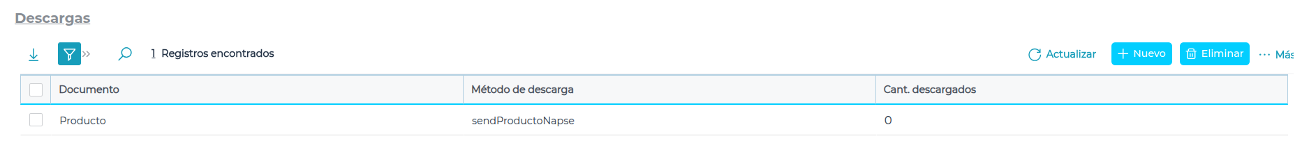 Ir a Menú > Deals > Descargas > Mis descargas > Nuevo > Buscar el documento “Producto” > Seleccionar el método sendProductoNapse > Presionar “Confirmar” > Ingresar al método de descarga > Habilitar casilla “Activar Webhook” > Configurar “Parámetros públicos” y “Orígenes Permitidos”.