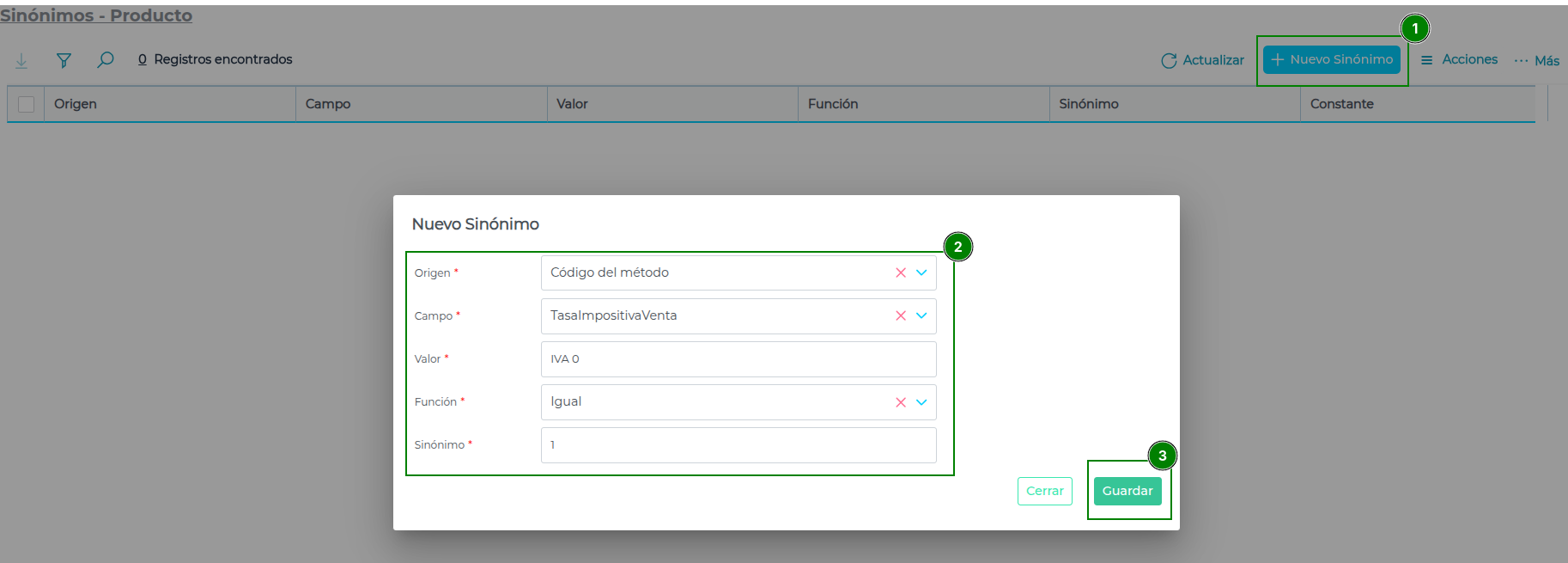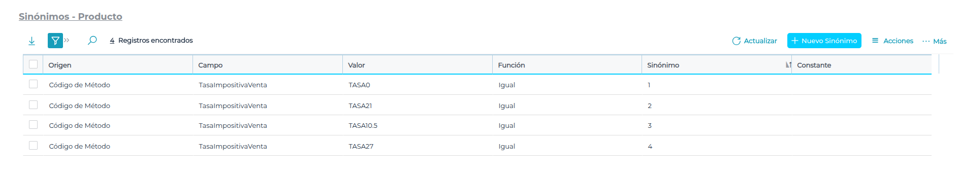 - Ir a Menú > Deals > Sinónimos > Buscar el documento “Producto” > Nuevo