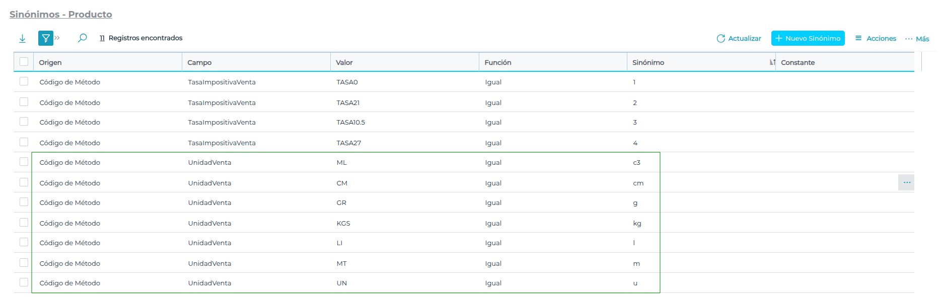 Los campos disponibles para ser sinónimos en la integración son: