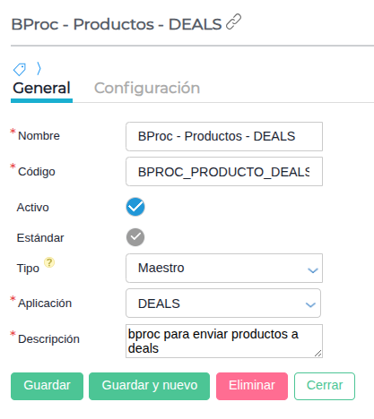 Se configuró un Bproc en el ERP, relacionado con el Maestro de Productos, para actuar como disparador automático ante la creación o actualización de productos, enviando esta información a Deals: