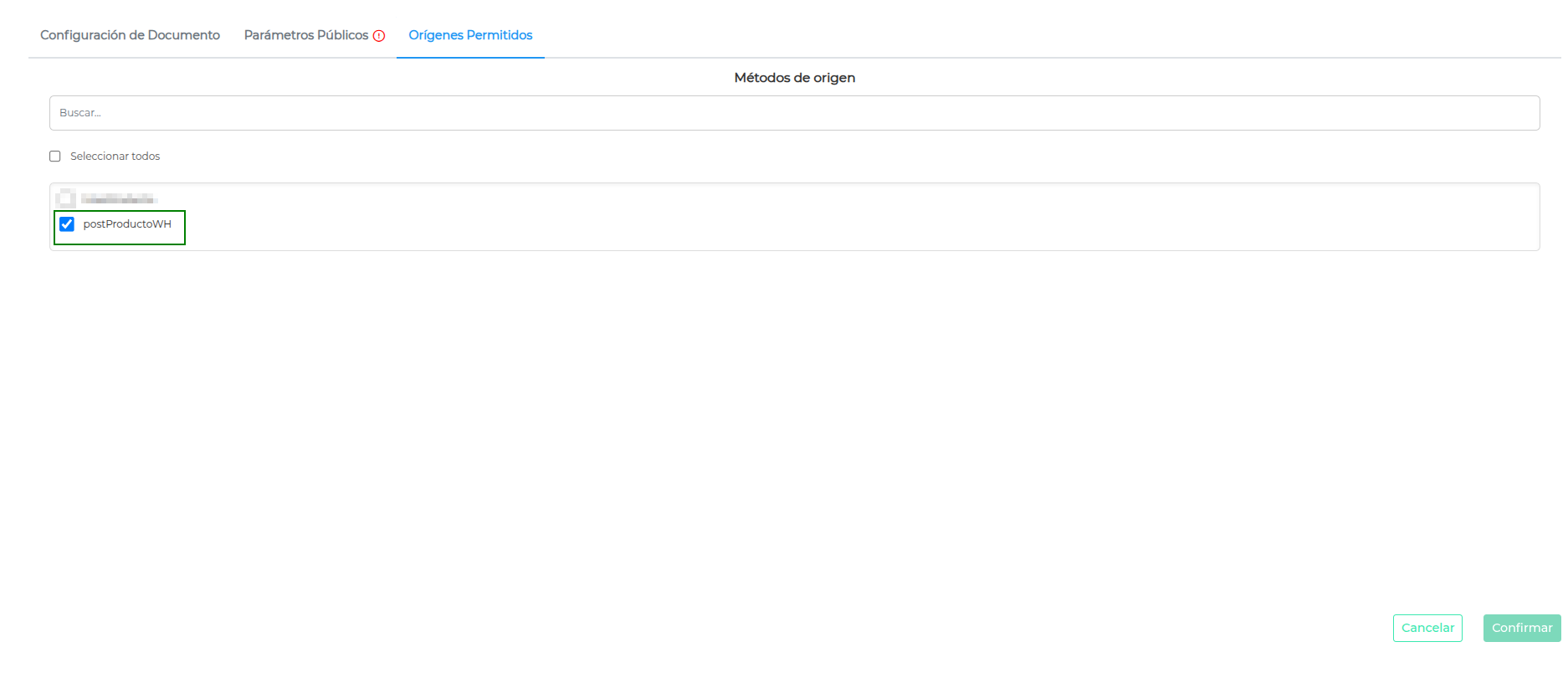 En la solapa “Orígenes Permitidos” se selecciona el código del método de publicación anteriormente configurado: postProductoWH