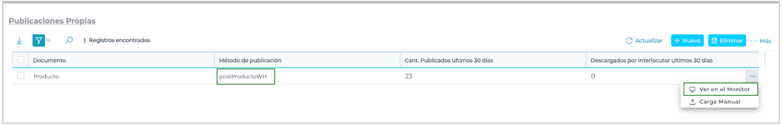 Ir a Menú > Deals > Publicaciones > Publicaciones propias > Buscar el código del método de publicación: postProductoWH > Ir a los tres puntos > Ver en el monitor: