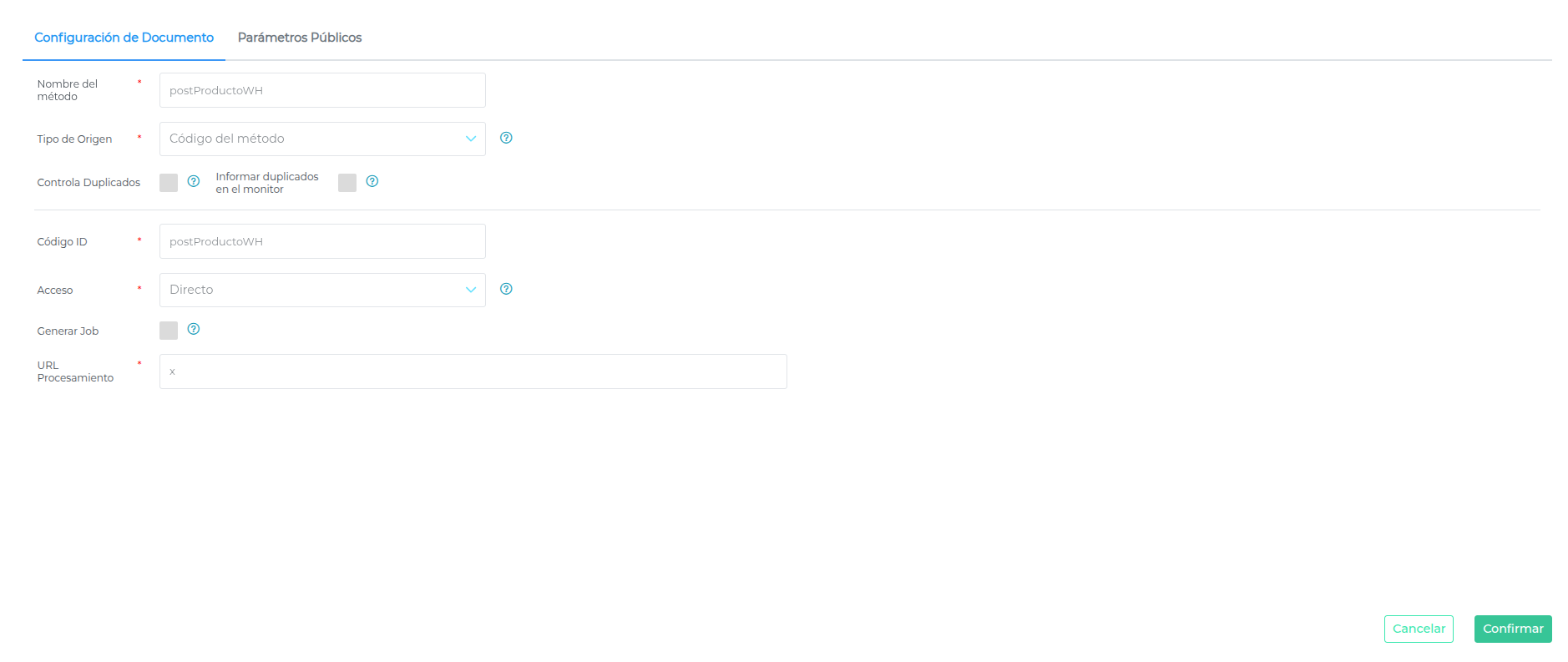 - Método de publicación (POST): postProductoWH