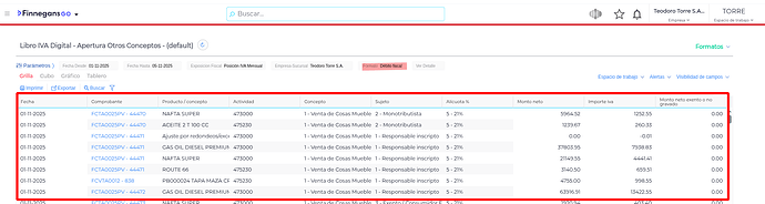 Una vez ejecutado el reporte, se podrá ver el detalle de todos los movimientos que lo conforman, pudiendo agrupar entre las distintas columnas para hacer un reporte dinámico que puede ser fácilmente comparable contra otros informes como los libros IVA o los análisis de facturas.