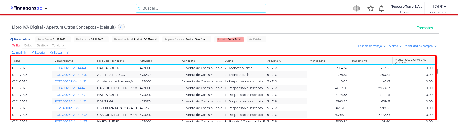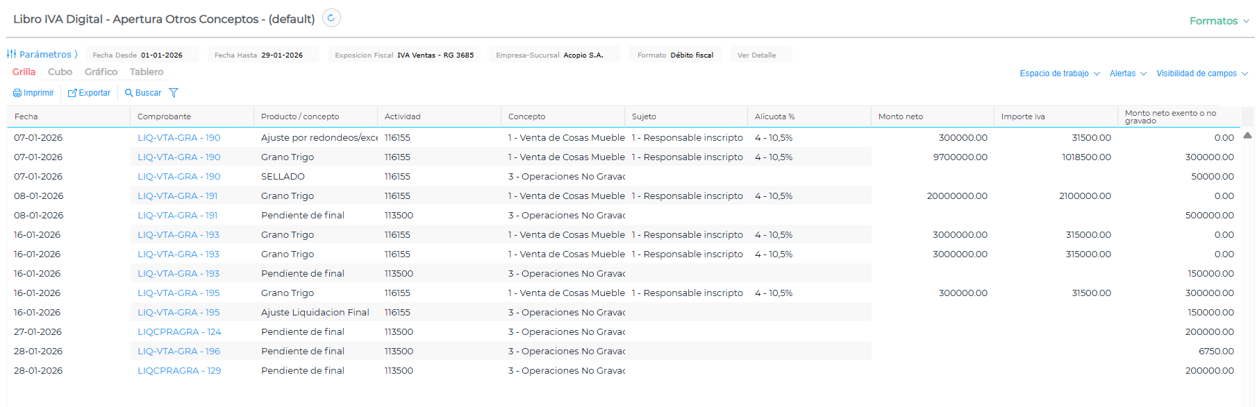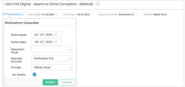 Es fundamental utilizar las mismas exposiciones fiscales aplicadas en el Libro IVA Digital: las de ventas para el débito fiscal (y su restitución) y las de compras para el crédito fiscal (y su restitución). Esto garantiza la consistencia obligatoria entre la información de dicho libro y lo declarado en ‘Otros Conceptos’.