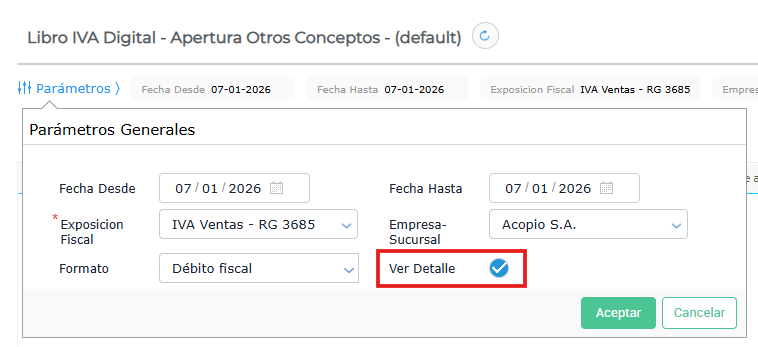 Check “Ver Detalle” : Si el check está desmarcado, el sistema ejecutará la vista resumida actual (totales por alícuota).
