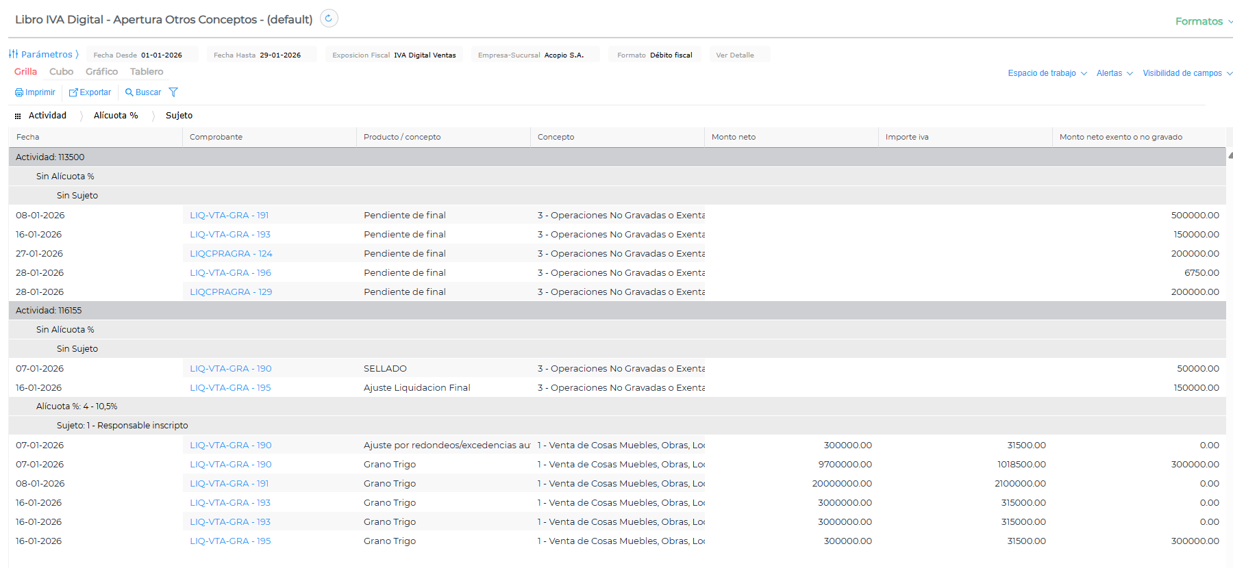 - El informe agrupa por cada venta/compra los ítems diferenciados por actividad, categoría y alícuota.