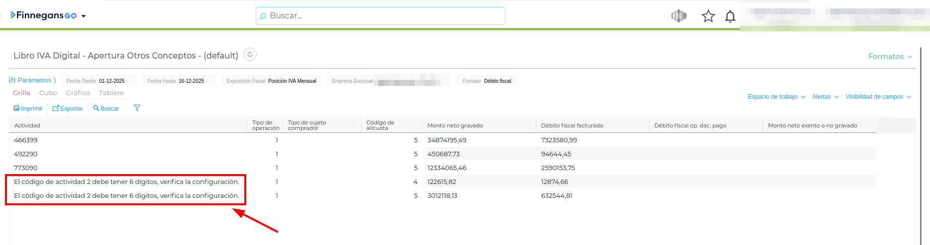 Consulta: Al querer exportar el archivo CSV del informe Libro IVA Digital - Apertura Otros Conceptos, aparece el siguiente mensaje de error en la columna Actividad: “El código de actividad 2 debe tener 6 dígitos, verifica la configuración”.