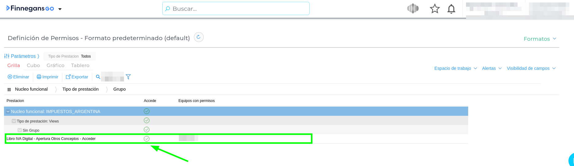 Respuesta: Esto se debe a una falta de permisos asignados al usuario o al equipo al que pertenece. Para poder acceder y visualizar el maestro “Libro IVA Digital - Apertura Otros Conceptos”, el usuario debe tener el permiso para la prestación “Libro IVA Digital - Apertura Otros Conceptos - Acceder”.