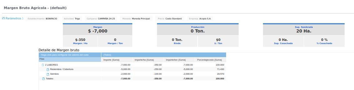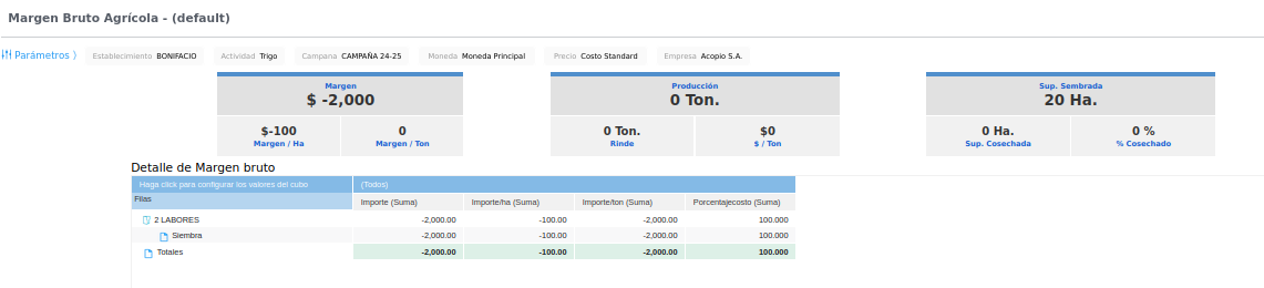En la siguiente labor, se puede ver que es de tipo siembra, por ende en el margen bruto se ve que se sembró 20 has y se representa como un costo.