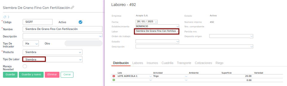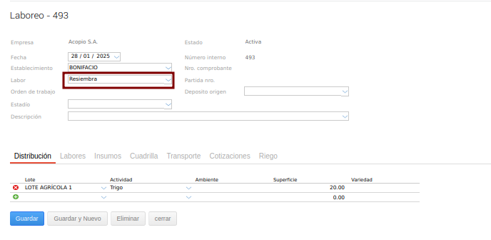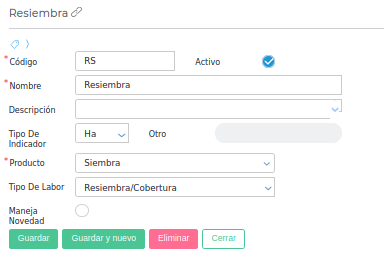 Se ha incorporado un nuevo tipo de labor denominado “Resiembra/Cobertura”. Este tipo de labor surge para solucionar la limitación de las labores de siembra tradicionales, las cuales descuentan hectáreas del tablero de avance y bloquean registros si se supera la superficie física del lote. Este se puede configurar en el maestro de Labores.