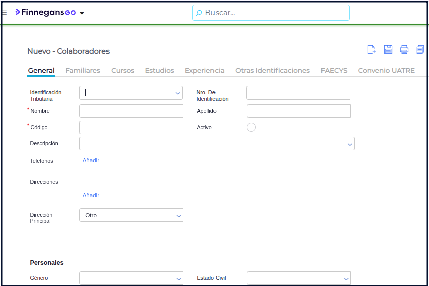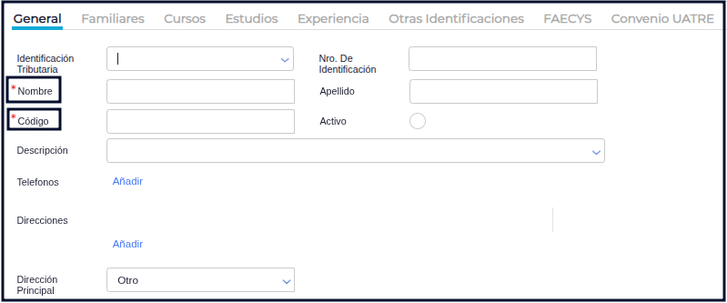 IMPORTANTE: el sistema sólo va a permitir guardar el registro si, como mínimo, el colaborador tiene cargado un nombre y un código, ya que estos son datos obligatorios.
