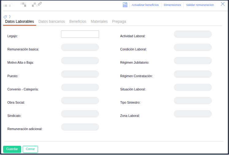 Dentro de la solapa de datos laborales, en el extremo superior derecho se pueden visualizar las siguientes opciones: