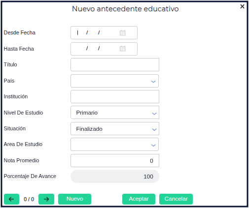 Se podrá indicar fecha desde y hasta de duración, título obtenido o por obtener, país, institución donde se realiza el estudio, nivel de estudio (primario, secundario, terciario, universitario o posgrado), situación (finalizado, en curso o inconcluso), área de estudio, nota promedio y porcentaje de avance.