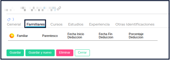 En esta solapa se podrán registrar los familiares que se desee del colaborador, indicando nombre y apellido, parentezco, fecha de deducción, porcentaje y demás.