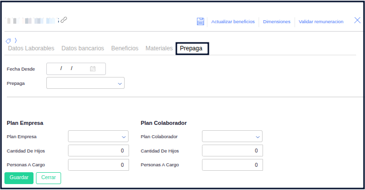 En esta sección se podrá registrar la prepaga a la cuál el colaborador pertenece, junto con el plan correspondiente y demás datos de interes.