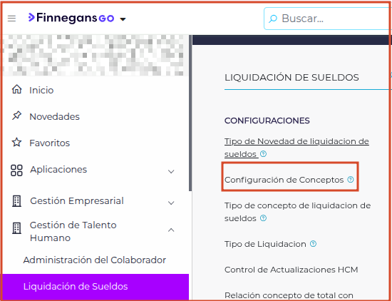 Ingresar al sistema, Gestión del Talento Humano, Liquidación de sueldos, Configuración de conceptos.