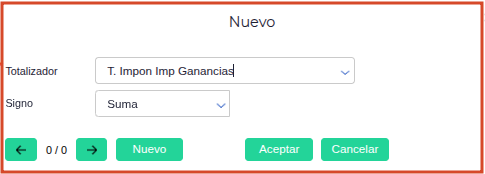 Una vez ahí hacer click en el signo + y agregar el totalizador “T. Impon Imp Ganancias” cuyo código es FINN_LCT_9050 con signo de suma. Una vez realizado esto, hacer click en aceptar.
