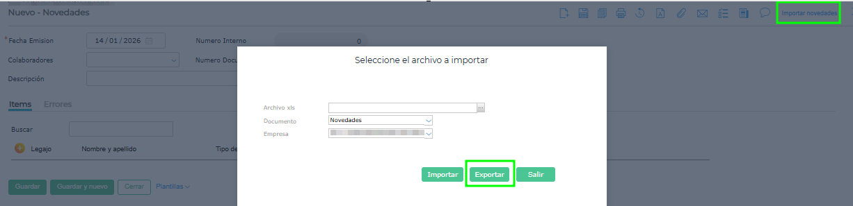 Menú → Gestión de Capital Humano → Liquidación de Sueldos → Novedad de liquidación de sueldosAl generar una nueva transacción de novedad y seleccionar “Importar Novedades” > “Exportar”, podras descargar la planilla de importación masiva