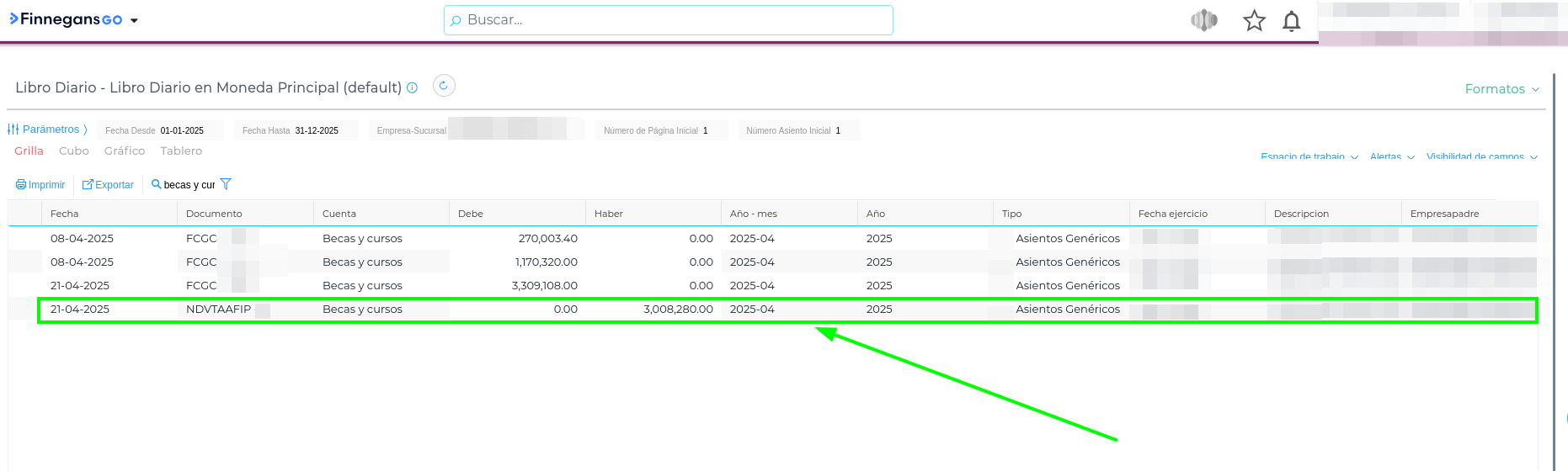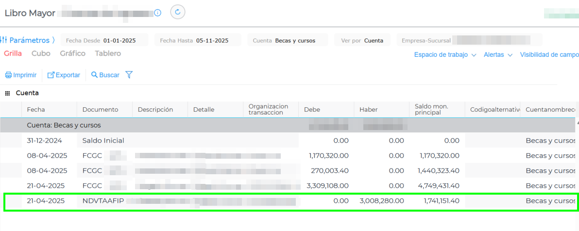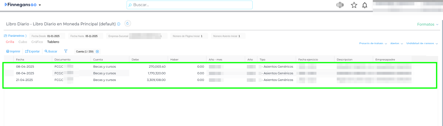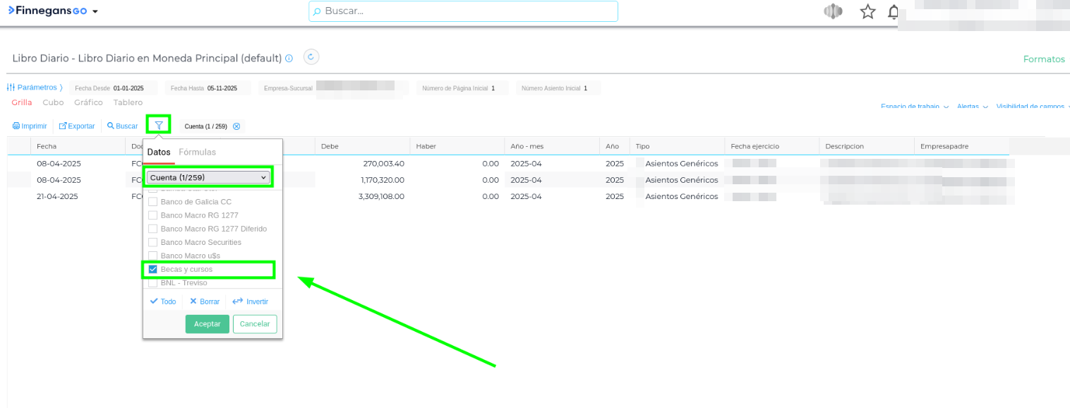 Utilice el filtro del “embudo” en la grilla y seleccione la Cuenta Contable específica (ejemplo: Becas y Cursos) para localizar los asientos que no aparecen en el listado general.