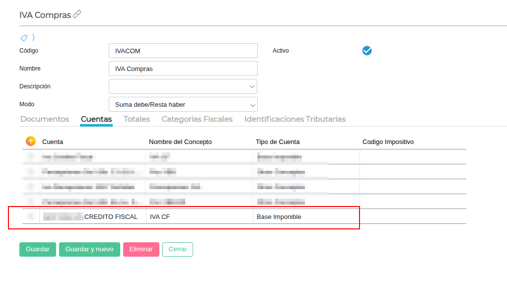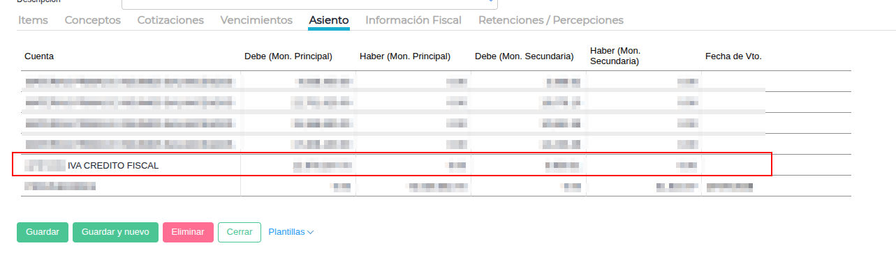 Diríjase a la solapa Asientos y verifique exactamente qué cuenta contable está recibiendo el importe del IVA.