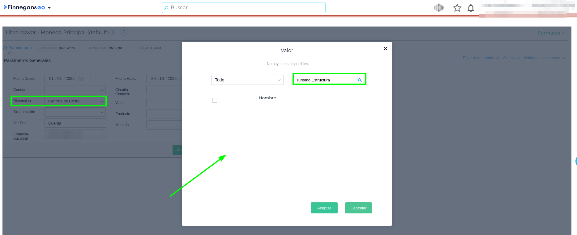 Buscar y seleccionar el Centro de Costo inactivo que se desea consultar (ejemplo: “Turismo Estructura”).