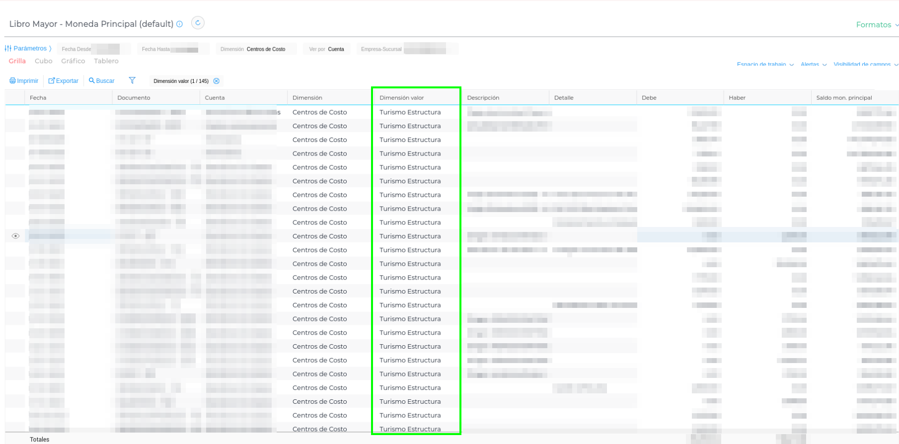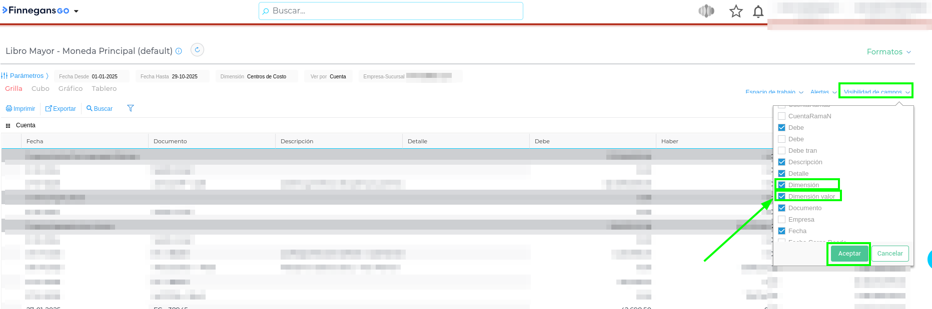 1 - Dirigirse al informe Libro Mayor y selecciona desde Visibilidad de Campos Dimension y Dimension Valor.