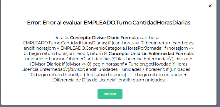Este inconveniente se manifiesta cuando, al procesar la liquidación, el sistema muestra un cuadro de alerta indicando que no puede evaluar la “Cantidad de Horas Diarias”. Como consecuencia, al revisar el detalle de la liquidación de los empleados afectados, todos los importes y conceptos figuran en 0, a pesar de haber ejecutado el proceso.