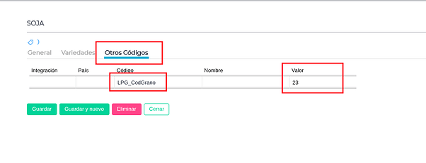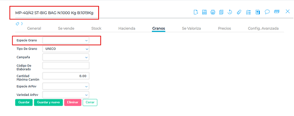 Acción: Asegúrate de que el producto que estás liquidando esté relacionado con una especie de grano. Esto se verifica en la solapa “Granos” del producto.