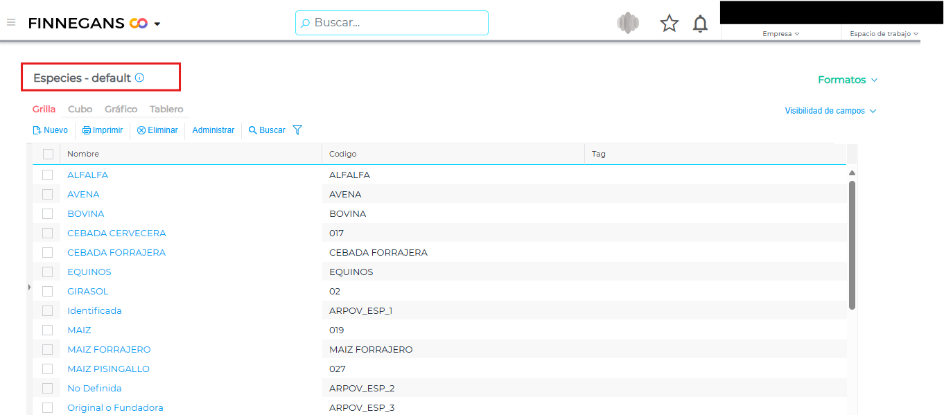 Ubicación: Menú → Gestión Empresarial → Granos → Especies.