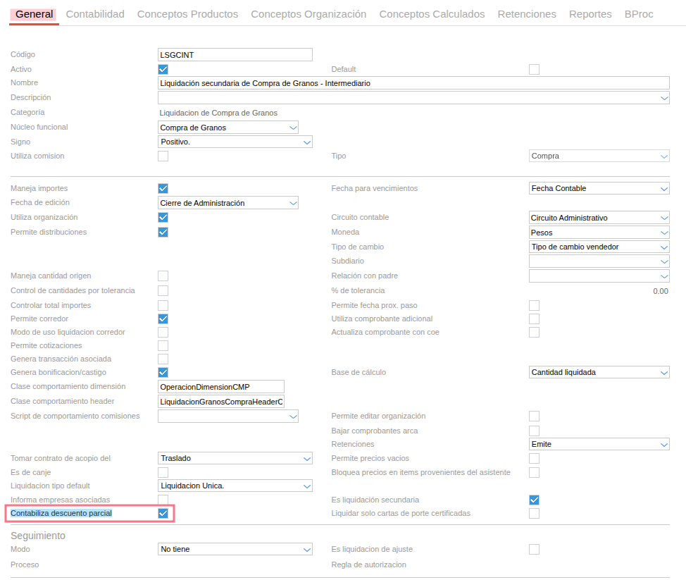 Si al generar una liquidación parcial observás que el concepto “Pendiente Final” aparece con valor cero a pesar de haber definido un porcentaje de parcialidad, esto se debe a que el check “Contabiliza Descuento Parcial” se encuentra desactivado en la definición del tipo de documento.