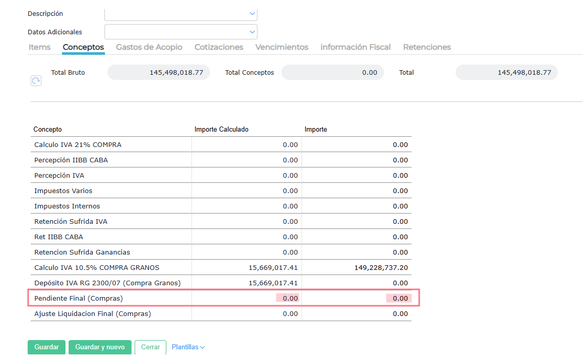 Una vez habilitada esta opción, el sistema reconocerá el porcentaje de parcialidad ingresado y calculará automáticamente el importe restante en el concepto “Pendiente de Final”. Este valor quedará correctamente registrado en la contabilidad como una cuenta a cobrar o pagar, permitiendo que la Liquidación Final cierre el ciclo de la operación sin inconsistencias.