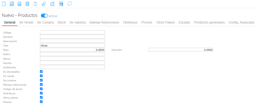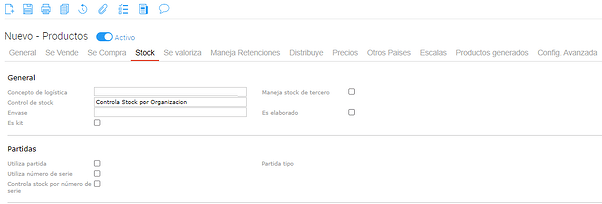 Activo: indica si el Producto se encuentra o no disponible para su utilización en nuevas transacciones. Si un registro se encuentra inactivo, el mismo no se puede utilizar dentro de la transacción correspondiente, pero sigue disponible para su consulta en los distintos reportes del sistema en donde intervenga. El poner inactivo es útil en aquellos casos que se desea impedir que los usuarios sigan utilizando un registro en particular, pero que por tener transacciones asociadas no se puede eliminar del sistema.