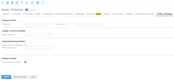 Otros países: al tildar este check habilita la solapa Otros países para realizar las configuraciones necesarias de otros países. Cuando se da de alta un producto nuevo, este check está sin tildar.