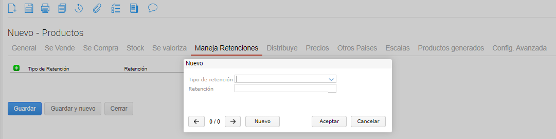 NOTA: La configuración de retenciones a nivel de producto tiene utilidad si y sólo si existiera algún tipo de retención que se encuentre configurada como que aplica Según Detalle. Caso contrario, la presente configuración no puede utilizarse por el sistema.