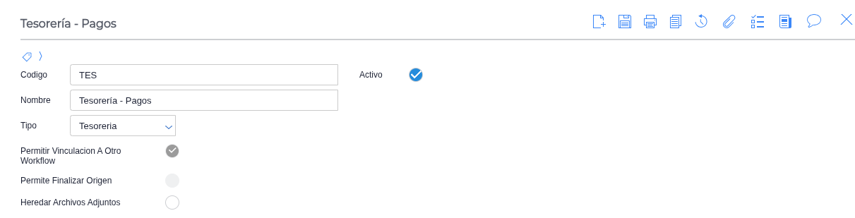Activo: indica si el workflow creado se encuentra o no disponible para su utilización en nuevas transacciones. Si un workflow se encuentra inactivo, no va a aparecer en las transacciones. El poner inactivo es útil en aquellos casos que se desea impedir que los usuarios utilicen un workflow dado, pero que por tener transacciones asociadas no se puede eliminar del sistema.