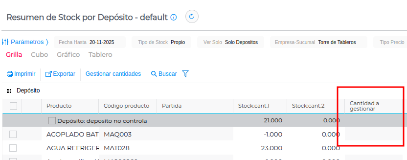Menú → Gestión Empresarial → Stock → Resumen de stock por depósito