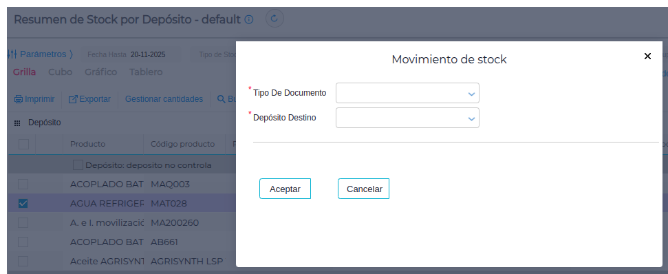 El depósito de origen se toma automáticamente de la línea activa al momento de ejecutar la acción.
