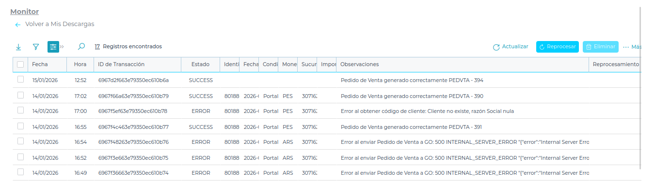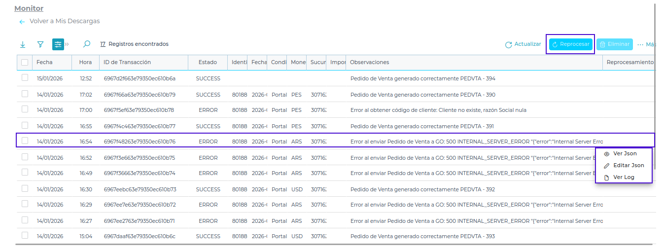 Los mensajes de error son a que devuelve el ERP, se puede modificar el Json para corregir el campo o revisar los sinónimos para re procesar el envió.