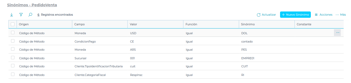 Para mapear correctamente los datos entre sistemas, configurar sinónimos para: