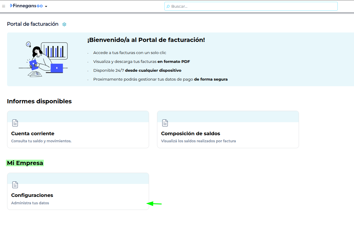 - Dentro del Portal de Facturación, localizar la sección Mi Empresa.