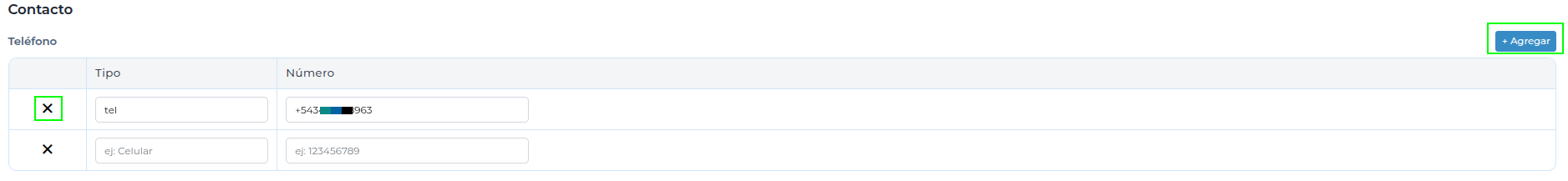 - La grilla de Teléfono lista todos los números de contacto, indicando su Tipo (ej: Celular, Fijo) y el Número.