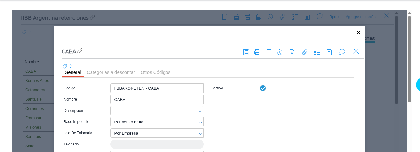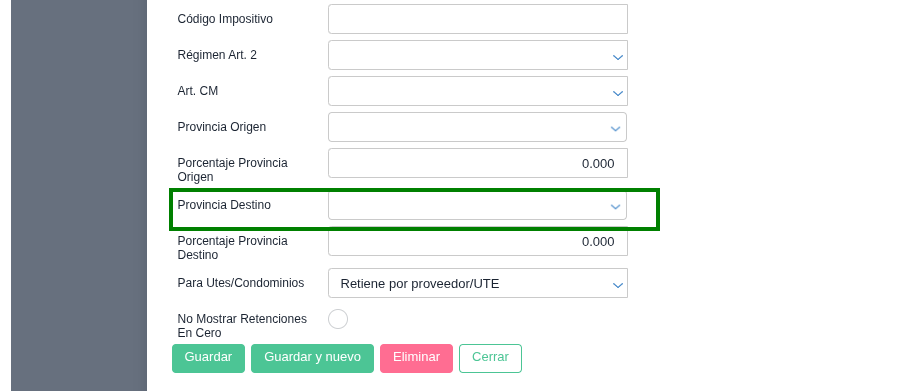 Configuración de Provincia: Para que los viejos tipos de retención aparezcan disponibles en el popup del asistente, deben tener la Provincia asignada dentro de su configuración en el Maestro de Tipos de Retención.