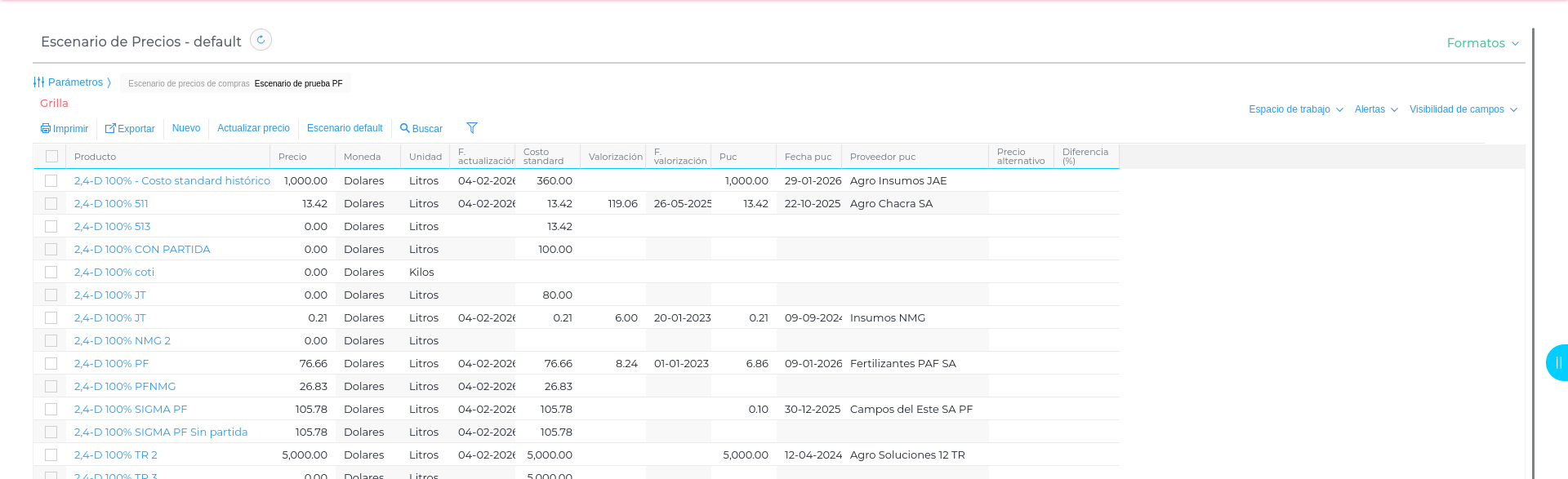 Asignarlo en el modelo, será de utilidad, ya que desde allí se pueden establecer diferentes alternativas de precios que servirán a la hora de presupuestar la gestión. Desde el escenario también se permite la comparación con otros y así como con los precios VNR, de valuación, PUC del producto.