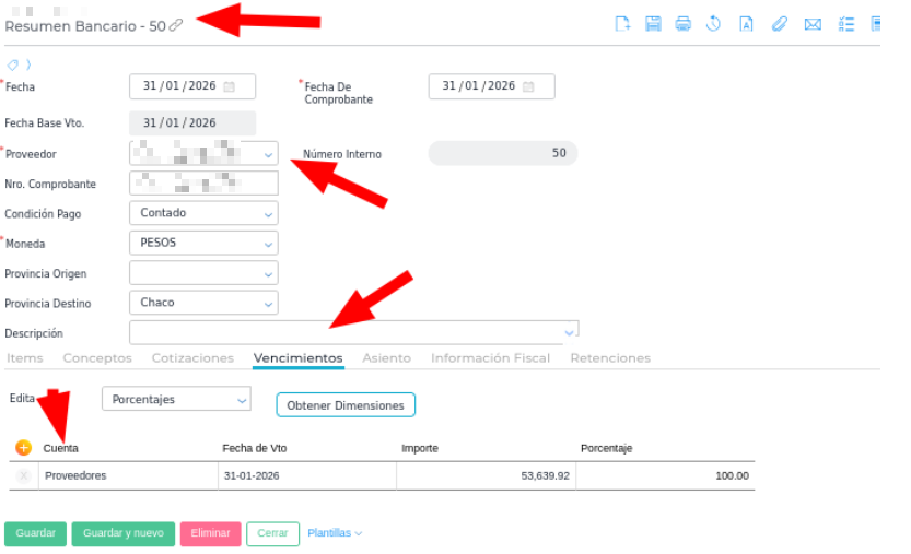 Para que la Conciliación Bancaria “levante” un registro, el asiento contable debe tener como contrapartida la cuenta del banco correspondiente. Si en la solapa Vencimientos del documento se selecciona la cuenta “Proveedores” (u otra cuenta de pasivo/gasto) en lugar de la cuenta patrimonial del banco, el sistema no reconocerá ese movimiento como un ítem conciliable para esa entidad financiera.