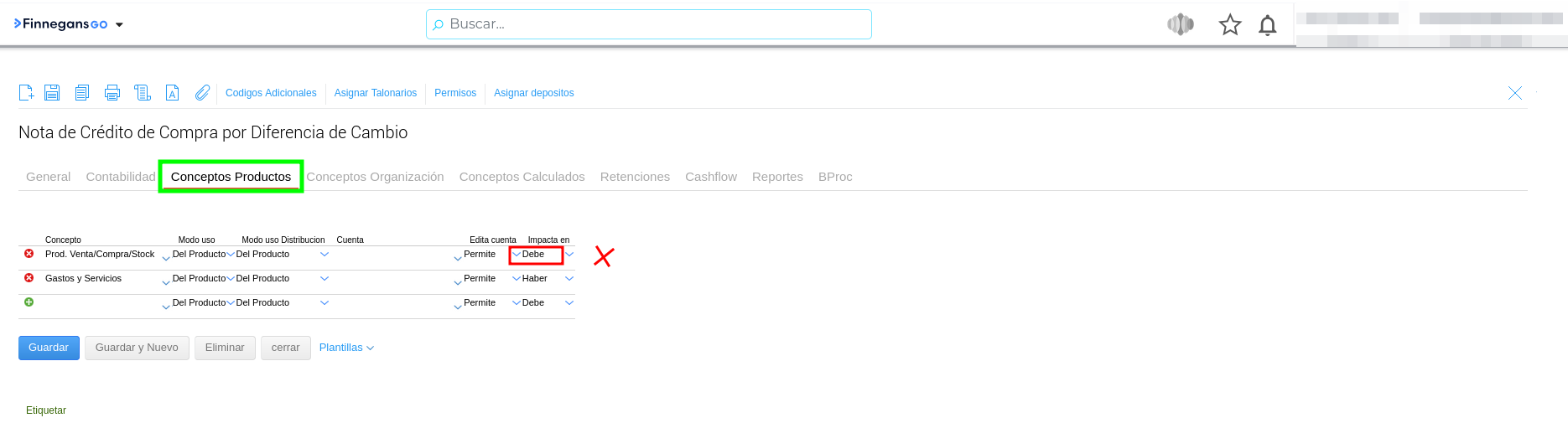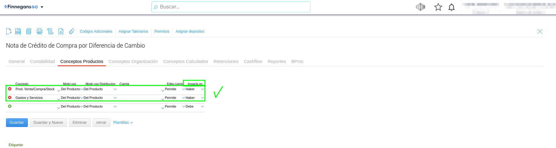 - Revisa que los conceptos asociados a la diferencia de cambio tengan activada la opción “Impacta en Haber”.