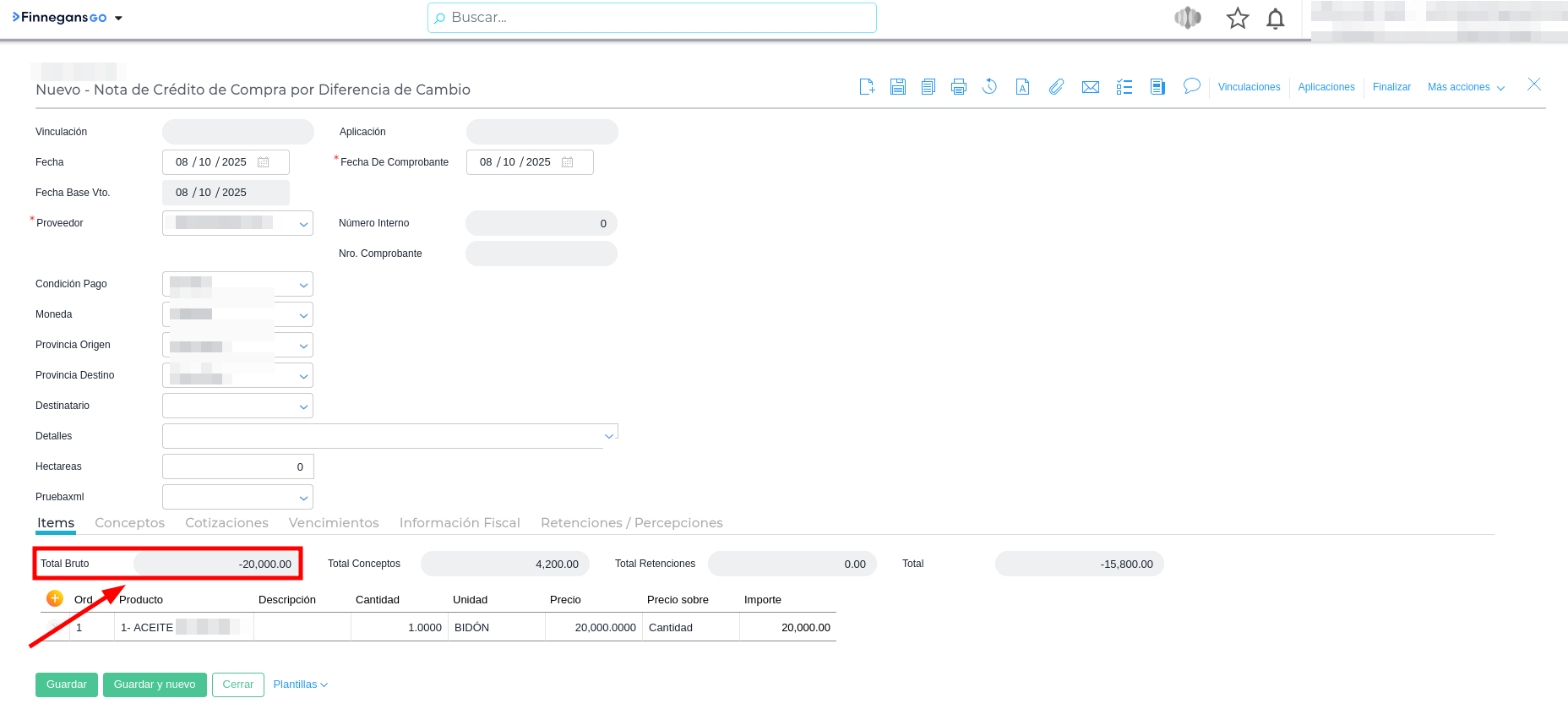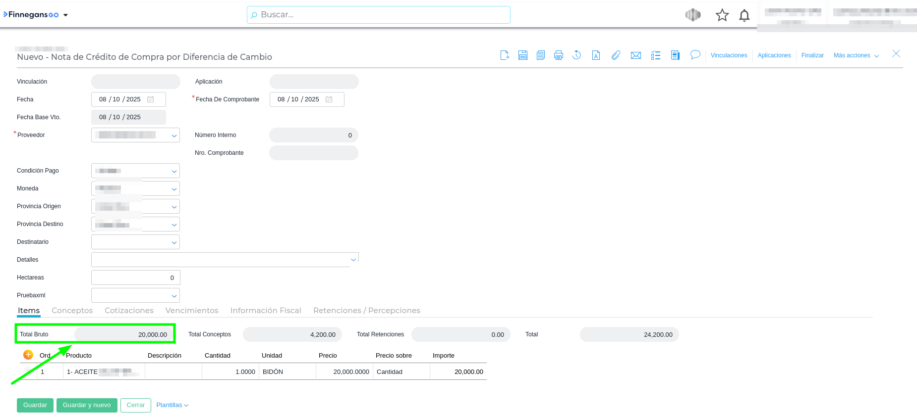 Genera una nueva Nota de Crédito de Compra por Diferencia de Cambio para confirmar que el campo Total Bruto se muestre correctamente.
