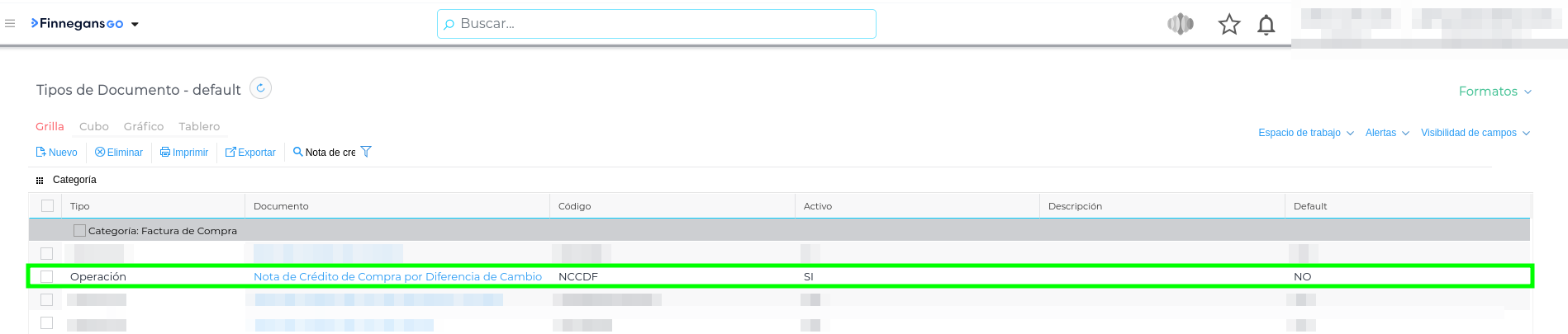 - Accede al maestro Tipos de Documento y busca el tipo “Nota de Crédito de Compra por Diferencia de Cambio”.