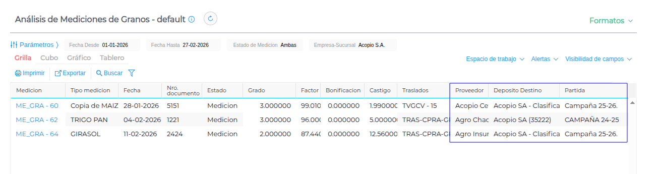 Se han agregado los campos “Proveedor”, “Depósito Destino” y “Partida” al reporte “Analisis de mediciones de Granos”.