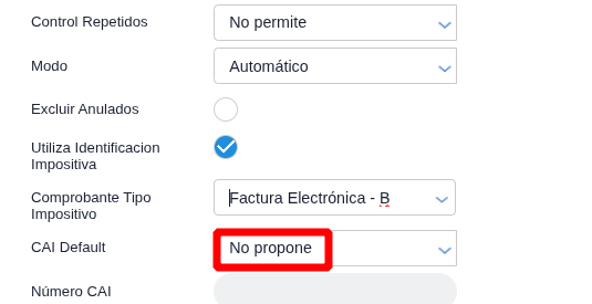- En el campo CAI Default, cambia la opción de “Ultima operación del tercero para el talonario” a “No propone”.